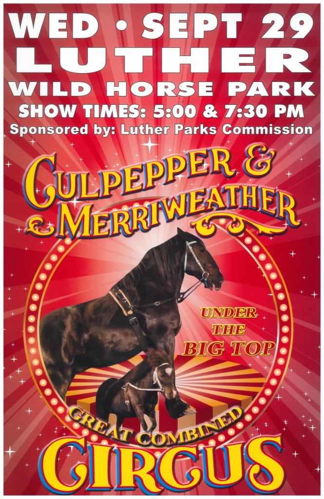 The Circus is coming to Luther. A fundraiser for Wild Horse Park, the event will be held on Wednesday, Sept. 29 for two big shows at 5 pm and 7 pm.